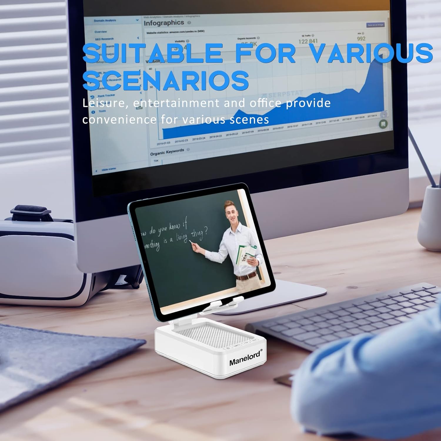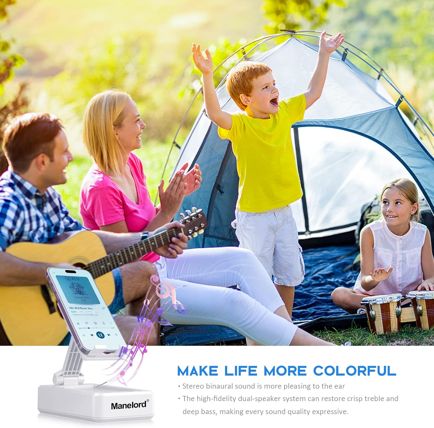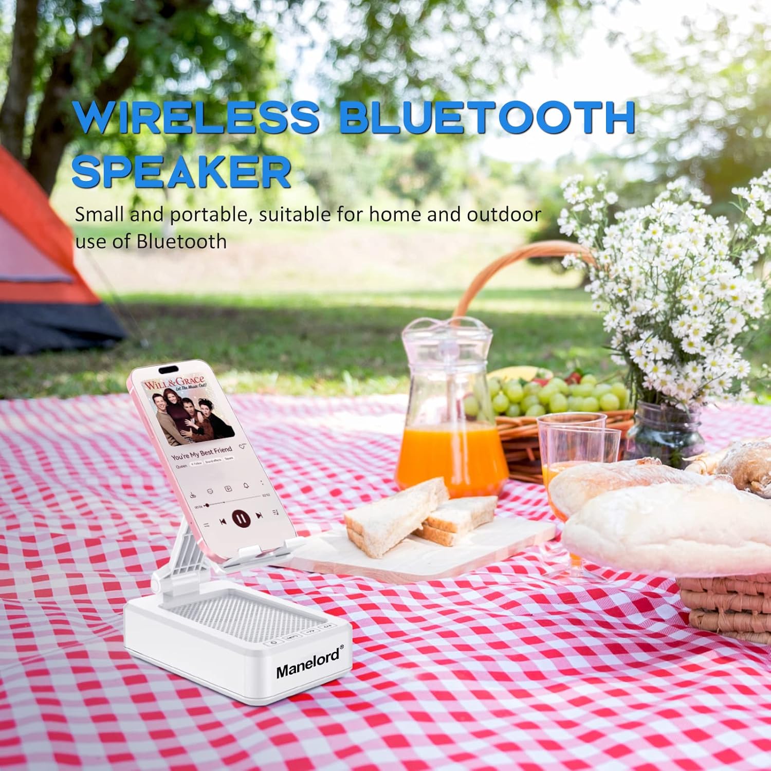 Outdoors playing with your family, Manelord Bluetooth Speaker delivers the sound you want and the portability you need.This cell phone stand with wireless bluetooth speaker, made distinguished by minimalist design, exquisite workmanship and adjustable angle structure, It accommodates your device with a solid support wherever you go, such as office, living room, kitchen, bedroom, etc.