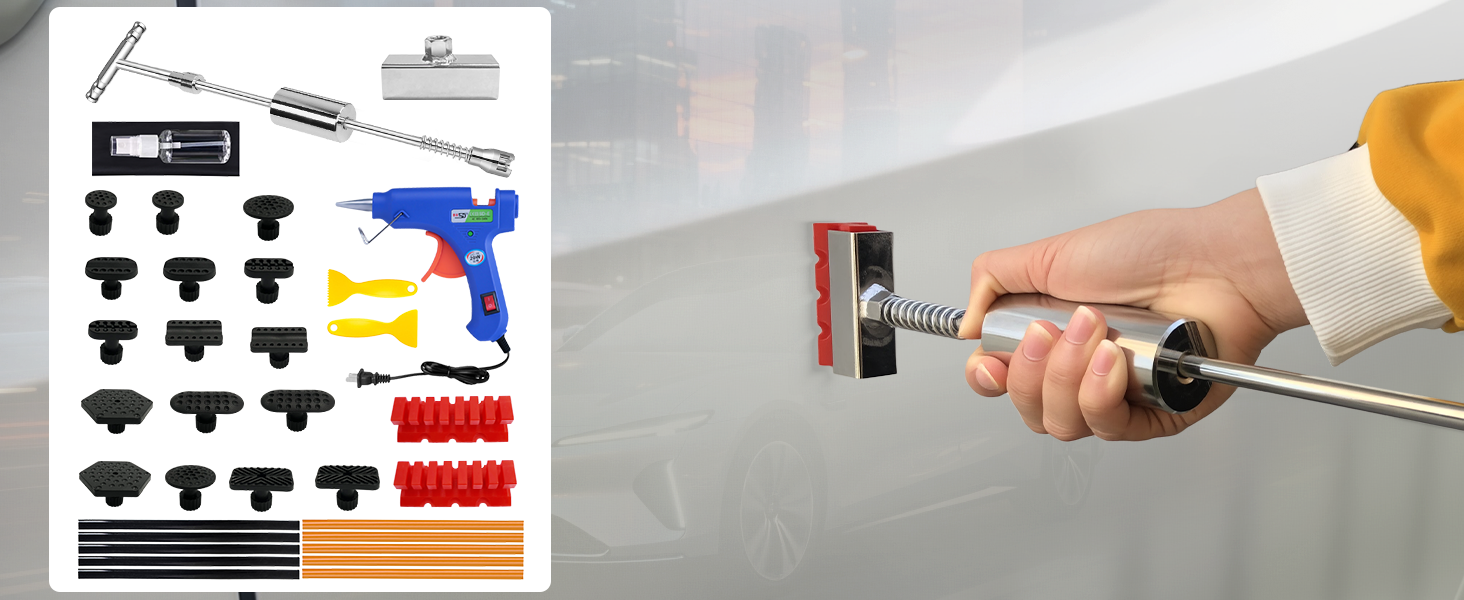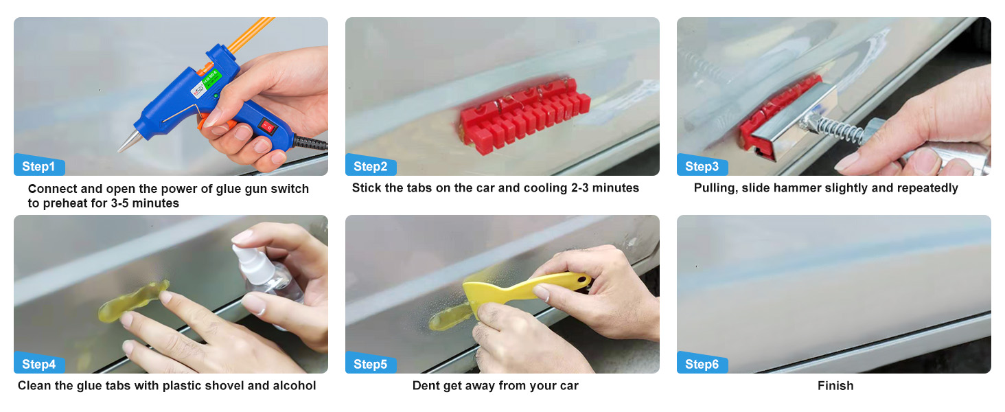Note: For detailed operation and more tools, please refer to the instruction manual. (Tips: This dent repair tool kit can effectively repair 90% of the repair effect, but not repair 100% of the perfect effect. Please read the instructions carefully before buying.)